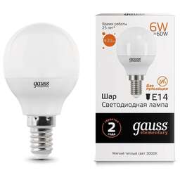 Бренд: GAUSS Тип товара: светодиодная PartNumber/Артикул Производителя: 53116 Энергосберегающая: ДА Описание: Светодиодная лампа Gauss - безопасный для здоровья и окружающей среды источник света. Она не пульсирует, мгновенно включается, не содержит ртути и имеет больший срок службы, чем лампы накаливания и КЛЛ, экономичнее ламп накаливания до 10 раз. Матовая: ДА Класс энергоэффективности: A+ Световой поток: 420 lm Максимальный срок службы: 25000 ч Угол светового пучка: 240 ° Габариты упаковки (ед) ДхШхВ: 0.24x0.18x0.05 м Объем упаковки (ед): 0.00216 м3 Серия: Elementary Патрон: E14 Количество ламп: 10 шт Цветовая температура: 3000 К Цвет свечения: белый теплый Индекс цветопередачи: 80 Тип лампы: светодиодная Степень защиты: IP20 Мощность: 6 Вт Напряжение питания: 220 В Вес упаковки (ед): 0.62 кг