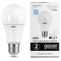 Бренд: GAUSS Тип товара: светодиодная PartNumber/Артикул Производителя: 23230 Энергосберегающая: ДА Колба: A60 Класс энергоэффективности: A+ Матовая: ДА Описание: Светодиодная лампа Gauss - безопасный для здоровья и окружающей среды источник света. Она не пульсирует, мгновенно включается, не содержит ртути и имеет больший срок службы, чем лампы накаливания и КЛЛ, экономичнее ламп накаливания до 10 раз. Световой поток: 950 lm Максимальный срок службы: 25000 ч Угол светового пучка: 240 ° Серия: Elementary Патрон: E27 Количество ламп: 10 шт Цветовая температура: 6500 К Цвет свечения: белый холодный Индекс цветопередачи: 80 Тип лампы: светодиодная Степень защиты: IP20 Мощность: 10 Вт Габариты упаковки (ед) ДхШхВ: 0.31x0.21x0.06 м Вес упаковки (ед): 0.444 кг Объем упаковки (ед): 0.003906 м3 Напряжение питания: 220 В
