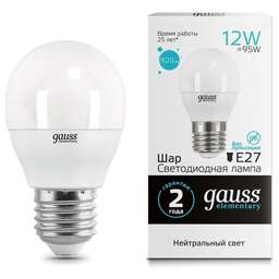 Тип товара: светодиодная Бренд: GAUSS PartNumber/Артикул Производителя: 53222 Энергосберегающая: ДА Описание: Светодиодная лампа Gauss - безопасный для здоровья и окружающей среды источник света. Она не пульсирует, мгновенно включается, не содержит ртути и имеет больший срок службы, чем лампы накаливания и КЛЛ, экономичнее ламп накаливания до 10 раз. Матовая: ДА Класс энергоэффективности: A+ Световой поток: 920 lm Максимальный срок службы: 25000 ч Угол светового пучка: 240 ° Патрон: E27 Серия: Elementary Количество ламп: 10 шт Цветовая температура: 4100 К Цвет свечения: белый нейтральный Индекс цветопередачи: 80 Тип лампы: светодиодная Степень защиты: IP20 Мощность: 12 Вт Вес упаковки (ед): 0.44 кг Габариты упаковки (ед) ДхШхВ: 0.12x0.045x0.045 м Объем упаковки (ед): 0.000243 м3 Напряжение питания: 220 В
