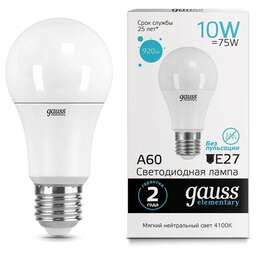 Бренд: GAUSS Колба: A60 Тип товара: светодиодная Энергосберегающая: ДА PartNumber/Артикул Производителя: 23220 Класс энергоэффективности: A+ Матовая: ДА Описание: Светодиодная лампа Gauss - безопасный для здоровья и окружающей среды источник света. Она не пульсирует, мгновенно включается, не содержит ртути и имеет больший срок службы, чем лампы накаливания и КЛЛ, экономичнее ламп накаливания до 10 раз. Световой поток: 920 lm Максимальный срок службы: 25000 ч Угол светового пучка: 240 ° Вес упаковки (ед): 0.7 кг Серия: Elementary Патрон: E27 Количество ламп: 10 шт Цветовая температура: 4100 К Цвет свечения: белый нейтральный Индекс цветопередачи: 80 Тип лампы: светодиодная Степень защиты: IP20 Мощность: 10 Вт Габариты упаковки (ед) ДхШхВ: 0.305x0.215x0.06 м Объем упаковки (ед): 0.0039345 м3 Напряжение питания: 220 В