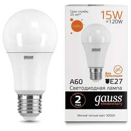 Бренд: GAUSS Колба: A60 Тип товара: светодиодная PartNumber/Артикул Производителя: 23215 Энергосберегающая: ДА Класс энергоэффективности: A+ Матовая: ДА Описание: Светодиодная лампа Gauss - безопасный для здоровья и окружающей среды источник света. Она не пульсирует, мгновенно включается, не содержит ртути и имеет больший срок службы, чем лампы накаливания и КЛЛ, экономичнее ламп накаливания до 10 раз. Световой поток: 1320 lm Максимальный срок службы: 25000 ч Угол светового пучка: 240 ° Габариты упаковки (ед) ДхШхВ: 0.31x0.24x0.06 м Вес упаковки (ед): 0.64 кг Объем упаковки (ед): 0.004464 м3 Серия: Elementary Патрон: E27 Количество ламп: 10 шт Цветовая температура: 3000 К Цвет свечения: белый теплый Индекс цветопередачи: 80 Тип лампы: светодиодная Степень защиты: IP20 Мощность: 15 Вт Напряжение питания: 220 В