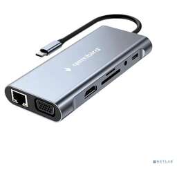 Док-станция Type-C Gembird UHB-D3, 8в1: USB2.0, USB3.1, Type-C PD87W, Type-C, HDMI, SD/TF, RJ45, кабель 20см, алюминий