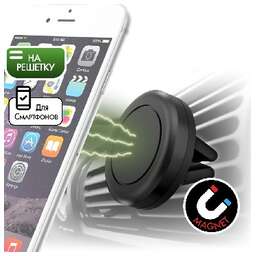 Универсальный магнитный держатель в вентиляционную решетку автомобиля. Для мобильных устройств весом до 280 грамм. В комплекте две металлические пластинки. Поворот на 360°.