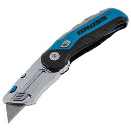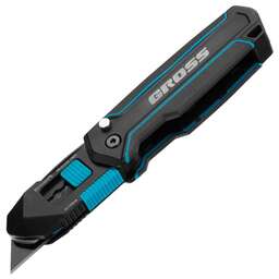 Складной ремонтно-монтажный нож Gross 78882 длиной 175 мм, с трехкомпонентной рукояткой, контейнером-держателем для лезвий и 2 запасными полотнами — режущий инструмент профессионального назначения. Используется для раскройки линолеума и обоев, разрезания картона, гипсокартона, кожи и других материалов. Нож защищен от самопроизвольного раскладывания — на боковой части имеется специальный стопор, фиксирующий держатель лезвия внутри корпуса. Преимущества Износостойкость — лезвие из высокопрочной японской стали SK-2 толщиной 0,6 мм долго сохраняет режущие свойства. Высокий ресурс — трапециевидное лезвие служит долго, т.к. при износе его можно перевернуть другой стороной и продолжать работу. Быстрая замена лезвий — для извлечения старого полотна достаточно нажать на специально предусмотренную кнопку. Удобное хранение расходников — запасные полотна размещаются внутри держателя (кассета предусмотрена кассета для 2 лезвий). Расходники в комплекте — к ножу прилагается 2 запасных лезвия, и их не нужно приобретать отдельно. Комфортная работа — нож не выскальзывает из ладони благодаря эргономичной трехкомпонентной рукоятке с рельефной поверхностью.