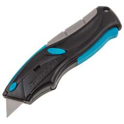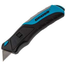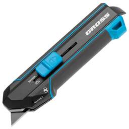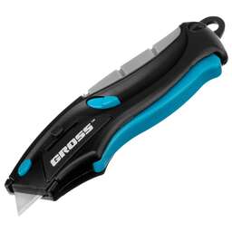 Ремонтно-монтажный нож Gross 78879 длиной 175 мм, с кнопочным автоматическим выбросом и возвратом лезвия, трехкомпонентной рукояткой и 5 запасными лезвиями, поможет раскроить линолеум или обои, разрезать картон, тонкий пластик, кожу, провода. Удобен в использовании — выброс лезвия и его возврат происходят автоматически при нажатии на кнопку с тыльной стороны корпуса. Нож является инструментом профессионального назначения, также будет полезен в быту. Преимущества Износостойкость — режущая кромка долго не тупится, т.к. полотно изготовлено из высокотвердой японской стали SK-2 толщиной 0,6 мм. Безопасность — на пусковой кнопке предусмотрен замок-предохранитель, предотвращающий ее случайное нажатие. Высокий ресурс — если режущая кромка придет в негодность, полотно просто нужно повернуть другой стороной. Быстрая замена лезвия — изношенное полотно извлекается нажатием на кнопку в передней части корпуса. Продуманная конструкция — сменные лезвия не потеряются, т.к. хранятся внутри корпуса ножа. Расходники в комплекте — запасные полотна не нужно приобретать отдельно. Комфортная эксплуатация — трехкомпонентная рельефная рукоятка не скользит в руке, поэтому долгая работа с инструментом не вызывает усталость.