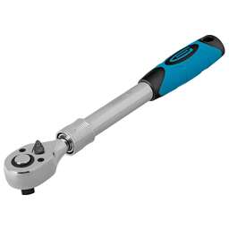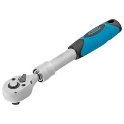 Телескопический хромированный трещоточный ключ Gross 14070, 305-445 мм, из стали CrV, с присоединительным квадратом 1/2 дюйма и 2-компонентной рукояткой, предназначен для монтажных работ с резьбовыми соединениями. Особенно удобен для работы в труднодоступных местах, т.к. имеет запатентованный механизм фиксации телескопической рукоятки. Ее длину можно изменить с 305 до 445 мм. Инструмент используется в слесарных мастерских, автосервисах, пригодится и в быту. Преимущества Высокая износостойкость — ключ-трещотка изготовлен из прочной стали хромованадиевой группы. Долговечность — хромированная поверхность устойчива к ржавчине и воздействию агрессивных веществ. Расширенные возможности — реверсивный механизм позволяет использовать инструмент как для закручивания, так и для откручивания крепежей. Легкая замена оснастки — кнопка быстрого сброса упрощает съем и установку насадок. Высокая плавность работы — храповой механизм с 72 зубцами имеет шаг 5 градусов. Надежная фиксация насадки — благодаря присоединительному квадрату с шариком оснастка не соскакивает во время работы. Комфортная эксплуатация — удобная двухкомпонентная ручка надежно ложится в руку и не выскальзывает из ладони.