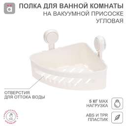Угловая полка предназначена для размещения различных гигиенических средств и других принадлежностей. Позволяет сэкономить пространство и организовать расстановку вещей в ванной комнате, сохранив уют и порядок. Оснащена крючками. Изделие фиксируется на различных вертикальных поверхностях при помощи водостойких вакуумных присосок. Такой многоразовый тип крепления обеспечивает быструю установку одним нажатием без использования клея и специальных инструментов. В основании предусмотрены отверстия, которые обеспечивают отток воды. Благодаря этому полка остается сухой, что препятствует возникновению вредных бактерий, в том числе грибка и плесени. Максимальный вес нагрузки составляет 5 кг. Материалы изготовления – АБС и ТПР. Цвет – белый. В комплектацию входят 2 вакуумных держателя, полка-корзинка и карточка для легкого снятия.