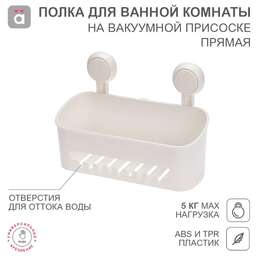 Прямая полка предназначена для размещения различных гигиенических средств и других принадлежностей. Позволяет организовать расстановку вещей в ванной комнате, сохранить уют и порядок. Изделие фиксируется на различных вертикальных поверхностях при помощи водостойких вакуумных присосок. Такой многоразовый тип крепления обеспечивает быструю установку одним нажатием без использования клея и специальных инструментов. В основании предусмотрены отверстия, которые обеспечивают отток воды. Благодаря этому полка остается сухой, что препятствует возникновению вредных бактерий, в том числе грибка и плесени. Максимальный вес нагрузки составляет 5 кг. Материалы изготовления – АБС и ТПР. Цвет – белый. В комплектацию входят 2 вакуумных держателя, полка-корзина и карточка для легкого снятия.