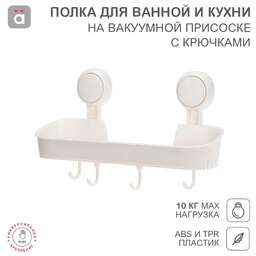 Полка предназначена для хранения различных предметов, косметики, гигиенических принадлежностей и т.д. Подходит для размещения на кухне и в ванной. Оснащена 4 съемными крючками. Изделие фиксируется на различных вертикальных поверхностях при помощи водостойких вакуумных присосок. Такой многоразовый тип крепления обеспечивает быструю установку одним нажатием без использования клея и специальных инструментов. В основании предусмотрены отверстия, которые обеспечивают отток воды. Благодаря этому полка остается сухой, что препятствует возникновению вредных бактерий, в том числе грибков и плесени. Максимальный вес нагрузки составляет 10 кг. Материалы изготовления – АБС и ТПР. Цвет – белый. В комплектацию входят 2 вакуумных держателя, полка, 4 крючка, карточка для легкого снятия.