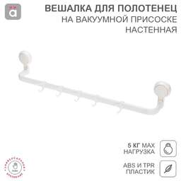 Вешалка для полотенец фиксируется на различных вертикальных поверхностях при помощи водостойких вакуумных присосок. Такой многоразовый тип крепления обеспечивает быструю установку одним нажатием без использования клея и специальных инструментов. Полка оснащена 5 крючками. Максимальный вес нагрузки составляет 5 кг. Материалы изготовления – АБС и ТПР. Цвет – белый. В комплектацию входят 2 вакуумных держателя, вешалка, 5 крючков и карточка для легкого снятия.