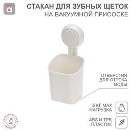 Стакан предназначен для размещения зубных щеток и других гигиенических принадлежностей. Изделие фиксируется на различных вертикальных поверхностях при помощи водостойкой вакуумной присоски. Такой многоразовый тип крепления обеспечивает быструю установку одним нажатием без использования клея и специальных инструментов. В основании предусмотрены отверстия, которые обеспечивают отток воды. Благодаря этому стакан остается сухим, что препятствует возникновению вредных бактерий, в том числе грибка и плесени. Максимальный вес нагрузки составляет 5 кг. Материалы изготовления – АБС и ТПР. Цвет – белый. В комплектацию входят вакуумный держатель, стакан и карточка для легкого снятия.