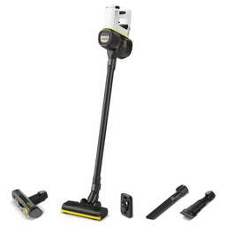 Компактный вертикальный беспроводной пылесос Karcher VC 6 Cordless ourFamily Car с мультициклонной системой фильтрации. Оснащен большой универсальной насадкой для пола со светодиодной подсветкой и мини-турбо-щёткой для тщательной уборки шерсти домашних животных.