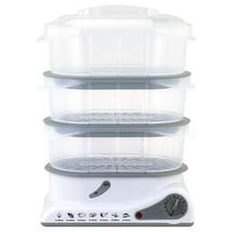 Электрическая пароварка; Мощность: 800 Вт; Объём всех ёмкостей: 7,5 л; Таймер на 60 минут; Управление: механическое; Материал корпуса: пластик, нержавеющая сталь; Нагревательный элемент из нержавеющей стали; Сеть: 220-240В, 50/60Гц,