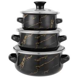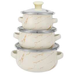 Набор из 6 предметов; Кастрюли: 0,5л, 0,7л, 1,1 л; С жаропрочными стеклянными крышками; 3-х слойное внешнее эмалированное покрытие; 3-х слойное внутреннее эмалированное покрытие; Подходит для индукционных плит.