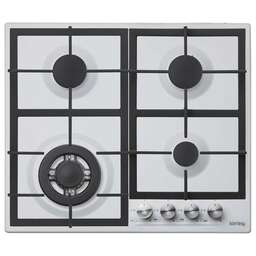Газовая варочная панель 60см, 4 высокоэффективные конфорки, WOK- сверхмощная конфорка с тройным рядом пламени, автоматический электроподжиг, газ-контроль каждой конфорки, передние металлические переключатели, чугунные решетки, цвет- белый