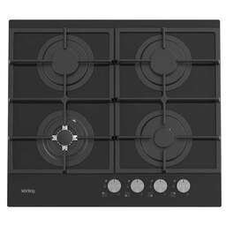 Газовая варочная панель из закаленного стекла, ширина 60 см, 4 высокоэффективные конфорки, автоматический электроподжиг, газ-контроль каждой конфорки, передние поворотные регуляторы, чугунные решетки для посуды, цвет - черный