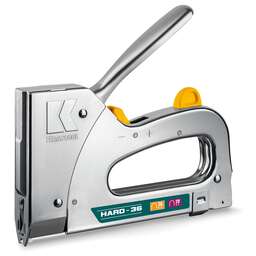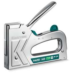 Профессиональный степлер предназначен для промышленного применения при интенсивных нагрузках. Прочный алюминиевый корпус и рабочие части из закаленной инструментальной стали обеспечивают высокую надежность конструкции. Обладает повышенным ресурсом, обеспечивает длительную и качественную работу. Преимущества 6 в 1 UNIVERSAL-HD - мощный универсальный профессиональный степлер. Одновременная работа со скобами с узкой (53) и широкой (140) спинками. Автоматическое определение типа скобы. +75% увеличенная мощность. Leaf-Spring мощный ударный механизмом рессорного типа, удар без отдачи Power-Control двухпозиционная регулировка силы удара. Fast-Load ускоренная загрузка скоб снизу. Безопасная фиксация рукоятки. Выступающий носик - для труднодоступных мест. Использование 53 (A|3|11) для крепления тканных материалов(ткани, обивки, холста) и материалов не несущих высоких нагрузок к поверхности из дерева, ДВП, пластика и т.п. Тонкая проволока не повреждает волокна материалов. 53F (D I 056 I 20GA) для надежного крепления проволочной сетки, тонкого металла, бумаги, текстильных, картонных, деревянных и других материалов 140 (G/11/57) для крепления нетканых материалов, пленок, уплотнителей, бумаги и картона к поверхности из дерева, пластика, двп и т.д. Широкая спинка скобы не прорезает прикрепленный материал. 13 (H I 37 I 19) для крепления тонких материалов и материалов не несущих высоких нагрузок 300 (E|J|8|47) прочное скрепления заготовок из дерева, пластика, двп и т.п. между собой. 500 (4…