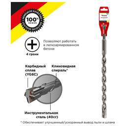 Бур по бетону с крестообразным наконечником KRANZ предназначен для сверления и бурения отверстий в слабоармированном бетоне, граните, кирпичной кладке и камне. Используется при проведении строительных и ремонтных работ. Бур применяется совместно с перфораторами, оснащенными креплением SDS PLUS, которое является стандартным для большинства электроинструментов. Благодаря конструкции со стабилизирующей спиралью, бур сохраняет точное положение в процессе сверления и обеспечивает равномерное распределение ударной нагрузки. Крестовая вставка из карбидного сплава (YG8C) с 4 гранями, расположенная на конце бура, способствует эффективному и быстрому входу в материал, что увеличивает долговечность бура и снижет вероятность его поломки при попадании в арматуру. Материал изготовления тела бура – инструментальная легированная сталь (40cr).