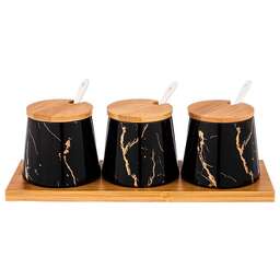 Коллекция "Fantasy" ТМ LEFARD - это модная сервировка стола и стильный кухонный интерьер в классическом черном с золотом цвете. Блюда и формы различных размеров, менажницы на бамбуковых подставках, банки, тарелки и салатники различного назначения, чайники, чайные пары и кружки выполнены из упрочненного фарфора. Четкие линии, сверкающее глянцевое покрытие. Вы и Ваш стол неотразим Посуда прошла сертификацию. Безопасна для контакта с пищевыми продуктами. Можно использовать в микроволновой печи. Не рекомендуется мыть в посудомоечной машине. Комплектность: банка с крышкой 280 мл - 3 шт, ложка фарфоровая - 3 шт, подставка деревянная 28*10*8,5 см - 1 шт.