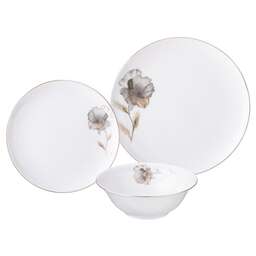 ТМ LEFARD коллекция "Времена года" выполнена из тонкостенного фарфора. Стильная форма, вместительный объем, модное сочетание пастельных тонов и цветочной деколи, отделка золотом - все это делает коллекцию неотразимой и очень привлекательной. Форма и цвет посуды способны оказать магическое действие на всех, кто находится за столом. «Времена года» могут согреть душу, создать тепло и уют в доме. Это прекрасный подарок. Продукция прошла сертификацию и безопасна для контакта с пищевыми продуктами. Можно ставить в микроволновую печь, не рекомендуется мыть в посудомоечной машине. Комплектность: тарелка обеденная 26,5*2,4 см - 6 шт., тарелка десертная 20*2 см - 6 шт., салатник 12*6,5 см 440 мл - 6 шт.