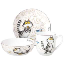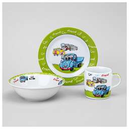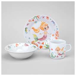 В наборе: тарелка ; тарелка суповая ; кружка<br /> Рекомендации по уходу: можно мыть в посудомоечной машине; можно использовать в СВЧ<br /> Материал - фарфор<br /> Создайте уникальную атмосферу волшебства и радости во время приема пищи для ваших любимых крох с ярким набором детской посуды. Кроме того, посуда выдерживает нагрев в микроволновой печи, что делает ее еще более удобной в использовании.
