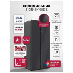 Количество камер: двухкамерный. Расположение морозильной камеры: сбоку. Тип управления: электронное. Класс энергопотребления: A+. Система размораживания: No Frost. Общий объем холодильника: 466. Общий объем холодильной камеры: 283. Общий объем морозильной камеры: 183. Уровень шума: 39. Количество компрессоров: один. Хранение при отключении питания: 7.5. Мощность замораживания: 8. Количество полок: 5. Количество ящиков: 1. Материал полок: закаленное стекло. Зона свежести: есть. Количество полок: 5. Система размораживания: No Frost. Тип: Холодильник. Хладагент: R600a. Количество ящиков: 1. Вес (нетто): 75. Количество дверей: 2. Тип компрессора: инверторный.