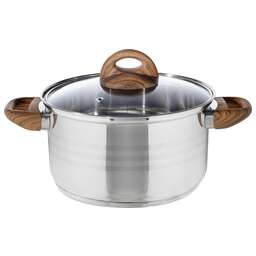 Кастрюля, FORESTA, объём: 3,5 л из нержавеющей стали с крышкой с ручками под дерево soft-touch Материал: нерж сталь, жаропрочное стекло, алюминий, сталь, бакелит, силикон. Объем: 3,5 л. Толщина стенок: 0,4 мм. Размер: 20*11,5 см. Дно: 3-слойное капсулированное (1 мм алюминия, сталь база для индукции). Подходит для всех типов плит. Полировка: внутри - зеркальная, снаружи - смешанная. Отметки литража. Крышка из жаропрочного стекла с отверстием для выпуска пара С -тип. Ручки - бакелитовые, с покрытием под дерево. Цветная коробка+пакет.