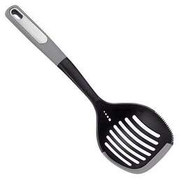 Лопатка с отверстиями CHEF из нейлона с силиконовым краем Материал: нейлон, силикон, полипропилен (ручка). Силиконовый край - защита посуды от царапин. *Край модели рифленый - предназначен для нарезки приготовленного мяса/стейков; рабочая часть дополнена тёркой для чеснока/имбиря, прочего. Картонная подложка + пакет.