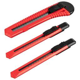 Набор Matrix 78985 состоит из 3 ножей с выдвижными лезвиями шириной 9-9-18 мм. Ими режут материалы, работа с которыми не требует особых усилий — картон, бумагу, обои, линолеум. Лезвия выдвигаются на необходимую длину в зависимости от толщины материала. Набор рекомендован для бытового использования. Преимущества Прочность и износостойкость — лезвия изготовлены из высокоуглеродистой стали 60. Быстрое восстановление режущей способности — достаточно отломить затупившийся сегмент полотна. Простая замена полотен — новое лезвие вставляется через хвостовую часть инструмента.
