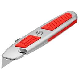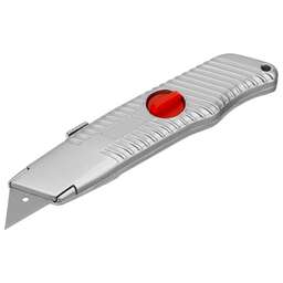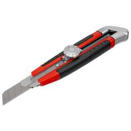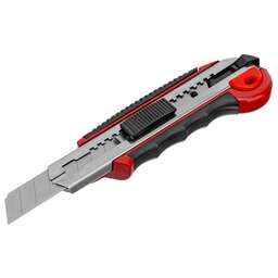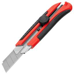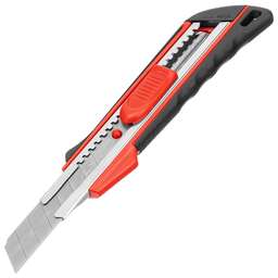 Нож Matrix 78914 с выдвижным лезвием шириной 18 мм, винтовым фиксатором и металлической направляющей используется в ходе ремонта и отделки помещений, будет полезен на складе, в офисе, в кожевенной мастерской, а также в быту. Легко режет бумагу, картон, линолеум, кожу, обои. Подходит для интенсивного использования, поскольку его конструкция усилена металлической направляющей. Преимущества Высокий ресурс — лезвие толщиной 0,5 мм изготовлено из высокоуглеродистой стали 60 и долго сохраняет режущую способность. Быстрое восстановление остроты — на полотно нанесены насечки, позволяющие удалить изношенный сегмент. Надежная конструкция — винтовой фиксатор удерживает лезвие в заданном положении. Долгий срок службы — производитель предусмотрел возможность замены лезвий. Быстрая замена лезвия — установка полотна осуществляется вручную через хвостовую часть и занимает несколько секунд. Эргономичность — двухкомпонентная рукоятка с рифлеными вставками не выскальзывает из ладони.