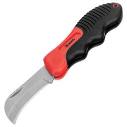 Складной нож электрика Matrix 78986 с изогнутым лезвием и эргономичной двухкомпонентной рукояткой используется для рассечения проводов и снятия с них изоляции. Изогнутое лезвие длиной 60 мм удобно для работы в стесненных условиях. Инструмент предназначен для электромонтажных работ, подходит для бытового применения. Преимущества Долговечность — режущее полотно из нержавеющей стали толщиной 2,5 мм устойчиво к повреждениям и коррозии. Комфортная и безопасная работа — двухкомпонентная пластиковая рукоятка с резиновыми вставками и подпальцевыми выемками не выскальзывает из ладони. Удобное хранение и транспортировка — инструмент имеет складную конструкцию, предусмотрено отверстие в рукоятке для подвешивания ножа на крючок или гвоздь.