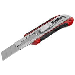 Нож Matrix 78959 с выдвижным лезвием шириной 25 мм, усиленной металлической направляющей и металлической обрезиненной ручкой служит для резания бумаги, картона, линолеума, обоев и других материалов. Благодаря усиленной направляющей нож не сломается даже при значительных нагрузках. Предусмотрена возможность ручной замены износившегося лезвия. Инструмент используется для проведения строительных работ, также полезен в быту. Преимущества Прочность и долговечность — полотно изготовлено из стали 60 толщиной 0,7 мм. Высокий ресурс — полотно долго сохраняет режущую способность, затупившийся сегмент можно отломить, и нож снова будет готов к работе. Надежная конструкция — винтовой фиксатор удерживает лезвие в рабочем положении. Комфортная работа — двухкомпонентная рукоятка с рифленой поверхностью не выскальзывает из руки.