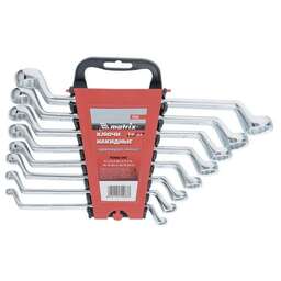 Набор Matrix 15410 включает 9 комбинированных ключей из стали CrV, размером 6-22 мм, с покрытием «матовый хром», которые пригодятся во время ремонтных работ дома или в гараже. С их помощью можно быстро монтировать и демонтировать крепежные элементы. В набор входят инструменты основных типоразмеров, позволяющие эффективно решать поставленные задачи.ПреимуществаВысокая деформационная стойкость — ключи изготовлены из хромованадиевой стали, а рабочие части закалены до твердости 45 HRC.Защита от разрушения — матовое хромоникелевое покрытие предотвращает образование коррозии.Аккуратная работа — накидные части с 12-гранным профилем охватывают всю поверхность крепежа, уменьшая риск деформации его граней.Комфортная работа в ограниченном пространстве — угол наклона кольцевых зевов относительно плоскости инструментов составляет 15°, что делает монтаж крепежа более удобным.Удобный пластиковый держатель — ключи не потеряются во время хранения и транспортировки.