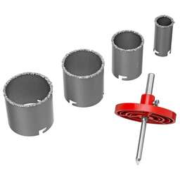 Набор коронок Matrix 72840 диаметром 33-53-67-73 мм, с 6-гранным хвостовиком, предназначен для сверления отверстий в керамической плитке с помощью дрелей и шуруповертов. Коронки эффективно справляются с керамической плиткой, кирпичом, газосиликатом, гипсокартоном, ячеистым бетоном и пенобетоном. Набор пригодится частному мастеру. Рекомендуется использовать водяное охлаждение и работать в безударном режиме для предотвращения поломки коронок. Преимущества Удобное использование — в комплект входит центрирующее (направляющее) сверло, облегчающее засверливание. Высокая прочность — рабочие части коронок и твердосплавная пластина центрирующего сверла изготовлены из сплава карбида вольфрама ВК6. Легкая подготовка к работе — универсальная державка позволяет быстро и надежно фиксировать коронки. Шестигранный хвостовик — сверло не прокручивается в патроне во время работы. Широкие возможности — в комплект входят коронки диаметром 33, 53, 67, 73 мм для сверления отверстий разного диаметра.