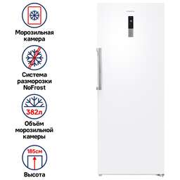 Класс энергопотребления: A++. Тип управления: электронное. Система размораживания: No Frost. Общий объем морозильной камеры: 382. Уровень шума: 40. Количество ящиков: 7. Мощность замораживания: 18. Перевешиваемые двери: есть. Потребление энергии: 310. Дисплей: есть. Количество компрессоров: 1. Хладагент: R600a. Полезный объем морозильной камеры: 380. Количество полок: 1. Регулируемые по высоте ножки: есть. Антибактериальное покрытие: есть. Вес (нетто): 85. Расположение дисплея: внешний. Габариты упаковки (ед) ДхШхВ: 0.75x0.75x1.91. Вес упаковки (ед): 93. Страна производства: Китай. Внутреннее освещение: есть. Инверторный компрессор: есть. Количество дверей: 1. Количество камер: однокамерный. Материал дверей: металл. Материал полок: стекло. Технология автоматического размораживания морозильной камеры: No Frost. Максимальная температура: 18. Минимальная температура: -24. Гарантия: 12 мес.. Размеры (ШхВхГ): 70 х 185 х 70 см. Цвет: белый. Климатический класс: ST. Индикация: открытой двери, температуры. Функции: защита от детей, режим холодильника, суперзаморозка. Объем: 382 л. Класс энергопотребления: A++. Температура: минимальная -24 °С, максимальная 18 °С. Разморозка: No Frost. Мощность замораживания: 18 кг/сут. Количество: ящиков 7, полок 1. Размеры (ШxВxГ): 70 х 185 х 70 см