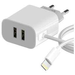 Проводное сетевое зарядное устройство с разъемом Lightning с 2 дополнительными USB разъемами на корпусе, входное напряжение: 100-240В, выходное напряжение: 5В, выходной ток: 2.4А, Длина кабеля 1,2м , цвет белый