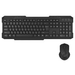Беспроводной комплект (клавиатура + мышь). Клавиатура полноразмерная, 112 клавиш (включая 8 мультимедийных), раскладка русская/английская, питание: 1 х батарейка типа AA. Мышка оптическая, светодиодная, 4 кнопки, макс, разрешение сенсора 1600dpi, питание
