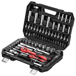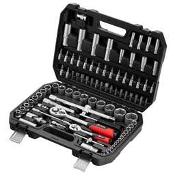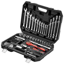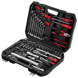 Набор инструментов MTX 135099 состоит из 94 предметов с присоединительными квадратами 1/2" и 1/4". Инструменты предназначены для монтажа и демонтажа резьбового крепежа с разными типами шлицев. В комплект поставки входят карданы, удлинители и переходники, облегчающие работу в труднодоступных местах. Набор используется для ремонта автомобилей, пригодится также в быту. Преимущества Прочность и износостойкость — элементы набора изготовлены из высококачественной стали CrV, на корпусе каждого трещоточного ключа предусмотрено защитное покрытие. Защита от разрушения — матовое покрытие предотвращает образование коррозии на инструментах и насадках. Удобная эксплуатация — храповики трещоточных ключей с 72 зубьями обеспечивают плавное вращение, торцевые головки с насечками и трещотки с прорезиненными рукоятками не проскальзывают в руках. Надежный захват насадки — на присоединительных квадратах трещоток предусмотрены шариковые фиксаторы. Комфортная работа одной рукой — направление вращения трещоток легко меняется при помощи переключателей с насечкой. Быстрое переключение между задачами — механизм быстрого сброса на трещотках облегчает замену насадок. Удобное хранение и транспортировка — набор упакован в ударопрочный пластиковый кейс с металлическими замками.