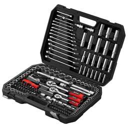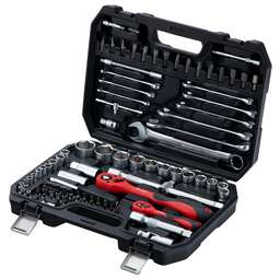 Набор инструментов MTX 13588 упакован в пластиковый кейс и состоит из 76 предметов с присоединительным размером 1/2" и 1/4", предназначенных для монтажа и демонтажа резьбового крепежа с разными типами шлицев, а также для ударных и других слесарно-монтажных работ. В комплект поставки входят карданы, удлинители и переходники, облегчающие работу в труднодоступных местах. Набор используется для ремонта автомобилей, а также полезен в быту. Преимущества Износостойкость — элементы набора изготовлены из высокопрочной стали. Надежная защита от коррозии — на инструменты нанесено матовое хромовое покрытие. Комфортная и эффективная работа — ключи-трещотки с 45 зубьями оснащены механизмом быстрого сброса, переключателем реверса с металлическим флажком и двухкомпонентной рукояткой. Прочная фиксация — шариковый замок на трещотках, воротке, шарнирах и удлинителях надежно удерживает головки. Удобное хранение и транспортировка — инструменты и насадки упакованы в ударопрочный пластиковый кейс с металлическими замками.