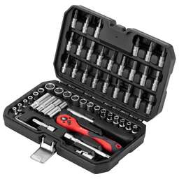 Набор инструментов MTX 135259 состоит из 56 предметов с присоединительным размером 1/4". Инструменты предназначены для работы с резьбовыми соединениями. В комплект поставки входит 2 удлинителя и кардан, упрощающие работу в труднодоступных местах. Набор будет полезен автолюбителю и домашнему мастеру. Преимущества Прочность и износостойкость — элементы набора изготовлены из высококачественной стали CrV, на корпусе трещоточного ключа предусмотрено защитное полипропиленовое покрытие. Защита от разрушения — матовое покрытие предотвращает образование коррозии на инструментах и насадках. Возможность работать в стесненных условиях — шаг трещотки составляет всего 5°. Комфортная работа — направление вращения трещотки легко меняется при помощи переключателя с насечкой, прорезиненная рукоятка трещотки не проскальзывает в руке, на торцевых головках есть антискользящие насечки. Быстрое переключение между задачами — механизм быстрого сброса на трещотке облегчает замену насадок. Надежный захват насадки — на присоединительном квадрате трещоточного ключа предусмотрен шариковый фиксатор. Удобное хранение и транспортировка — набор упакован в ударопрочный пластиковый кейс с металлическими замками.