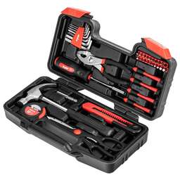 Набор инструментов MTX 13423, упакованный в пластиковый кейс, состоит из 39 предметов, предназначенных для монтажа и демонтажа резьбового крепежа с разными типами шлицев, а также для выполнения других слесарно-монтажных работ. В комплект поставки входят плоскогубцы переставные, отвертки, в том числе для точных работ, отвертка-держатель, молоток-гвоздодер, шестигранные ключи (имбусовые), биты-вставки с адаптером и удлинителем, рулетка, ножницы а также канцелярский нож. Набор оптимален для бытового использования. Преимущества Прочность и износостойкость — элементы набора изготовлены из высокопрочной стали методом ковки. Надежная защита от коррозии — на рабочие части нанесено матовое хромовое покрытие. Эргономичность — двухкомпонентные рукоятки плоскогубцев, отверток, отвертки-держателя, а также корпусы ножа и рулетки удобно ложатся в руку. Надежный хват — молоток-гвоздодер, отвертка-держатель и отвертки имеют рукоятки с рифлением и не выскальзывают из ладони. Небольшой вес 1,48 кг — набор удобно брать на выездные работы. Удобное хранение и транспортировка — инструменты и насадки упакованы в ударопрочный пластиковый кейс.