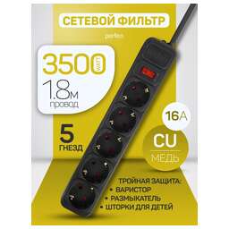 Сетевой фильтр модели Power+ от широкого производителя электротоваров Perfeo предназначен для подключения широкого спектра бытовой и электронной техники. У данной модели имеется провод размером 3 метра, 6 розеток с заземлением, кнопка выключения и установлен автоматический предохранитель - в случае перегрузки или короткого замыкания, предохранитель отключит входное напряжение.