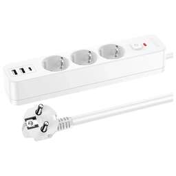 Сетевой фильтр 4 евророзетки и 3 USB порта на 2.4A, Длина 2м, Номинальный ток 10А, Максимальная нагрузка 2500Вт, Варисторная защита и защитные шторки для детей. Есть крепление на стену.