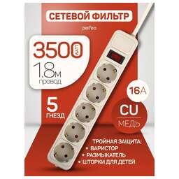 Помимо варисторной защиты которая служит для защиты вашей техники от высоковольтных разрядов (молний и индустриальных помех), специалисты компании Perfeo снабдили сетевые фильтры автоматическим предохранителем для отключения при перегрузках и коротких замыканиях. Благодаря этим системам защиты Вы можете быть спокойны за электроприборы в Вашем доме. Так же сетевые фильтры серии «REAL STREAM» имеют и другие достоинства: Удобная кнопка включения Корпус из ударопрочного негорючего материала Долговечный, гибкий и одновременно толстый, медный провод Качественный материал контактов розеток (латунь) Реальное сечение жилы 3*1,5мм (Cu-медь) Современный внешний вид