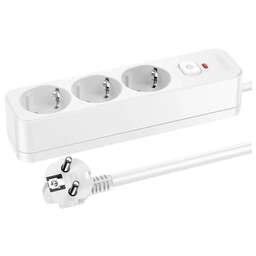 Cетевой фильтр, количество розеток - 3 (евростандарт с заземлением), номинальный ток нагрузки - 10А, номинальное входное напряжение - 220В, корпус из ударопрочного негорючего материала, длина кабеля - 5,0 м.