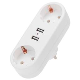 Многофункциональный электрический двойник с быстрой зарядкой позволяет подключить к бытовой розетке сразу два прибора со стандартной Евро-вилкой и одновременно три портативных устройства с USB-разъемами питания. Идеально подходит для бытовой техники: кофемашины, тостера, электрической зубной щетки, фена, а также и для мобильного телефона, наушников и т.д.