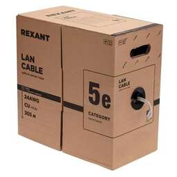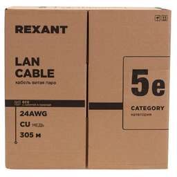 [Кабель] Rexant (01-0041-R) Кабель витая пара U/UTP, CAT 5e, PVC нг(А)-LS, 4х2х0,52мм, 4PR, 24AWG, INDOOR, SOLID, серый, 305м, РФ