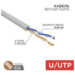 Кабель витая пара U/UTP категории 5е REXANT, цвет – серый, длина – 305 м. Используется при создании сетей передачи данных: локальных, домашних, компьютерных и т.д. Применяется при подключении телефонии, интернета, камер видеонаблюдения, устройств охранной системы и т.д. Обладает гибкостью, что позволяет с удобством размещать кабели в труднодоступных местах без образования заломов на местах сгиба.