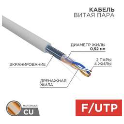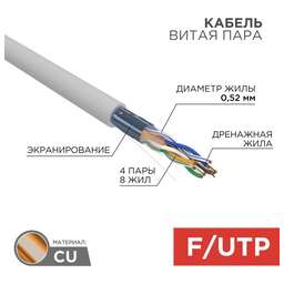 Кабель витая пара F/UTP категории 5е REXANT, цвет – серый, длина – 305 м. Используется при создании сетей передачи данных: локальных, домашних, компьютерных и т.д. Применяется при подключении телефонии, интернета, камер видеонаблюдения, устройств охранной системы и т.д.