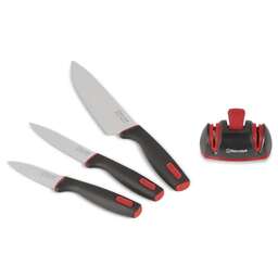 RONDELL RD-459 kroner набор ножей с точилкой 4 пр. В набор RD-459 входит: Точилка для ножей, Нож поварской 20 см, Нож универсальный 12.7 см, Нож для овощей 9 см. Высококачественная нержавеющая сталь X30Cr13. Твердость по шкале Роквелла 52-55 HRC. Двусторонняя заточка лезвий. Материал ручки - пластик и прорезиненные вставки с антибактериальными свойствами. Упаковка - блистер. Не подходит для использования в посудомоечной машине.